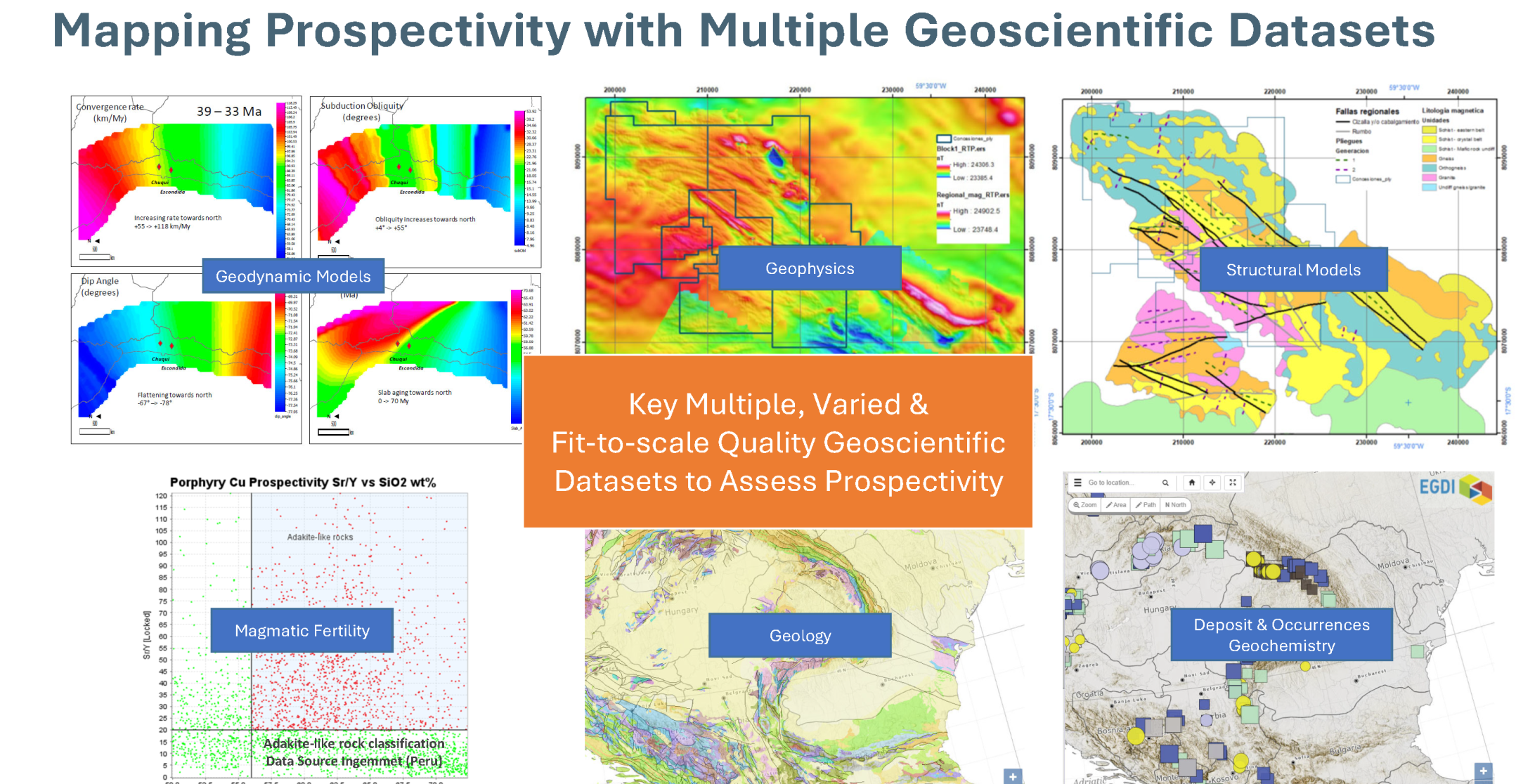 The work that we have been doing with Aldo involves compiling all the available data (geophysics, geology, geochemistry, etc), interpret it, and transform that into layers within the Mineral Systems approach. Therefore, rather than using a conductivity map from an EM survey, we assess the presence of magma sources that could give an idea on fertility; and instead of just mapping lineaments out of geophysical data, we identify favourable pathways for mineralizing fluids.